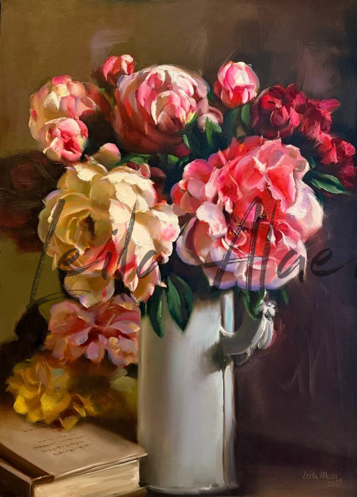 Petalborne lightBy Leila Alaei / November 26, 2025 Oilpainting on canvasPetalborne light(Silent speech among the flowers)70×50 cm